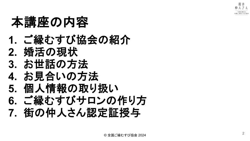 ご縁結び仲人認定講座が完成しました 2025.09.25 2025.09.26 ご報告 ご縁結び仲人認定講座が完成しました。 念願の認定講座のコンテンツができあがりました。 各テーマはこんな感じです。 詳細はコチラを御覧ください。 これから、どんどん街の仲人さんを養成していきたいです! みなさんも、ぜひ、ご参加ください。 問い合わせ LINEからの申込 Post Share この記事のタイトルとURLをコピーする 投稿者: machinogoen ご報告 一般社団法人全国ご縁むすび協会が発足しました 前の記事